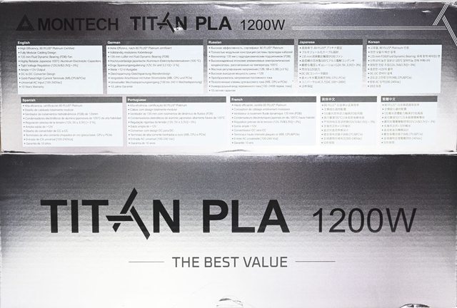 ▼外盒上側面有MONTECH商標、TITAN PLA名稱、輸出功率、多國語言產品特色簡介。外盒