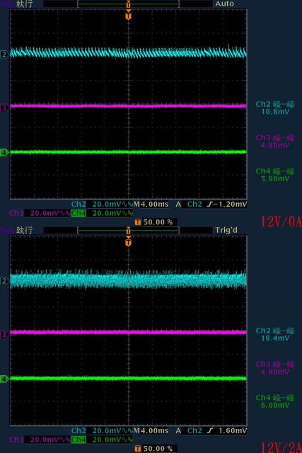 ▼輸出無負載(上圖)及輸出12V/2A(下圖)時漣波如下圖所示