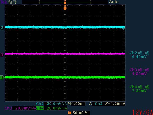 ○輸出12V/6A時無明顯漣波。綜合全負載輸出下12V/5V/3.3V各路低頻漣波分別為