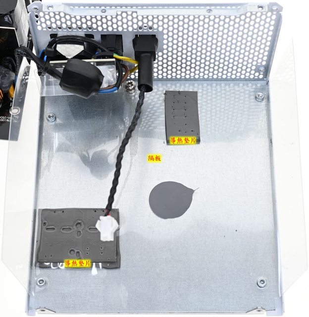 ▼外殼底部透明隔板於主電路板橋式整流區域貼上導熱墊片(右上),在二次側區域開孔及