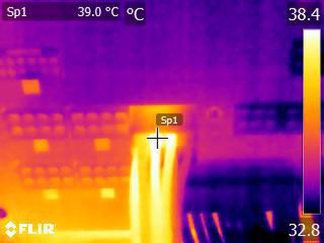 ▼單條EPS 4+4P連續輸出28A(336W)10分鐘後的電源端模組化接頭紅外線熱影像圖(附註: