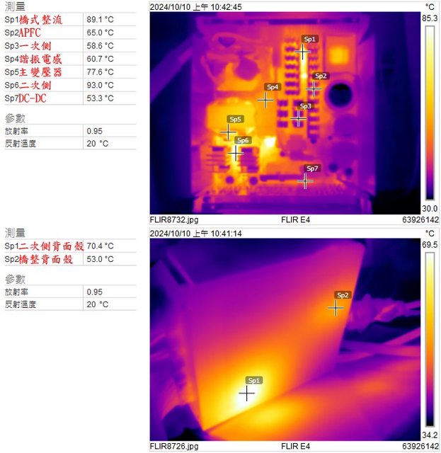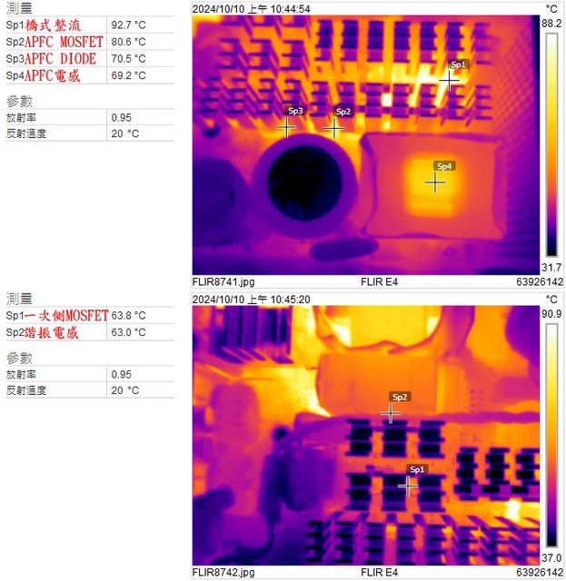 ▼電源供應器滿載輸出下內部(上圖)及背面外殼(下圖)的紅外線熱影像圖(附註:安裝位