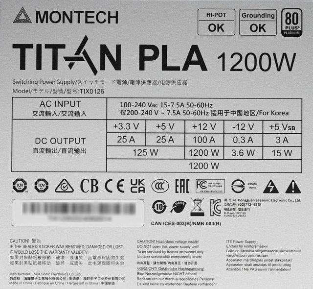 ▼本體背面標籤有MONTECH商標、80PLUS白金認證、TITAN PLA名稱、輸出功率、TIX0126