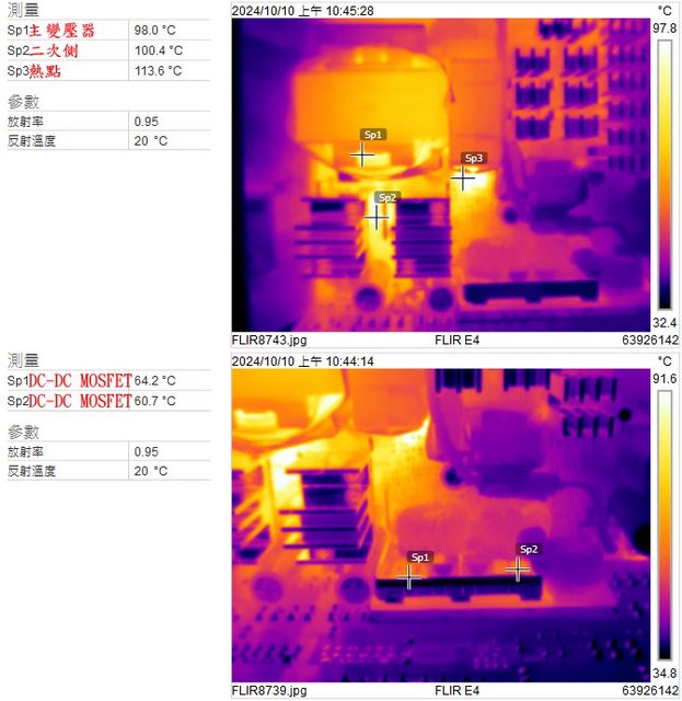 ▼電源供應器滿載輸出下主變壓器/二次側/熱點(上圖)及DC-DC MOSFET(下圖)的紅外線熱