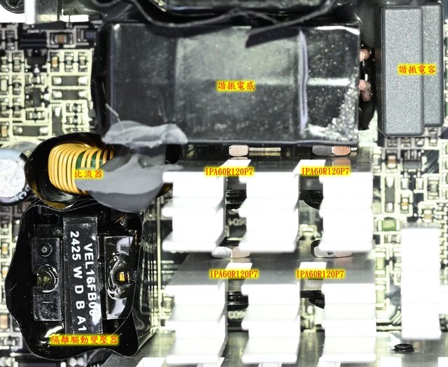 ▼電源供應器滿載輸出下橋式整流/APFC MOSFET/APFC DIODE/APFC電感(上圖)及一次側