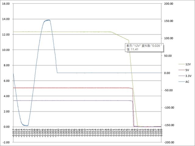 ○綜合全負載輸出狀態切斷AC輸入模擬電力中斷,12V於21ms開始壓降,26ms降至11.41V