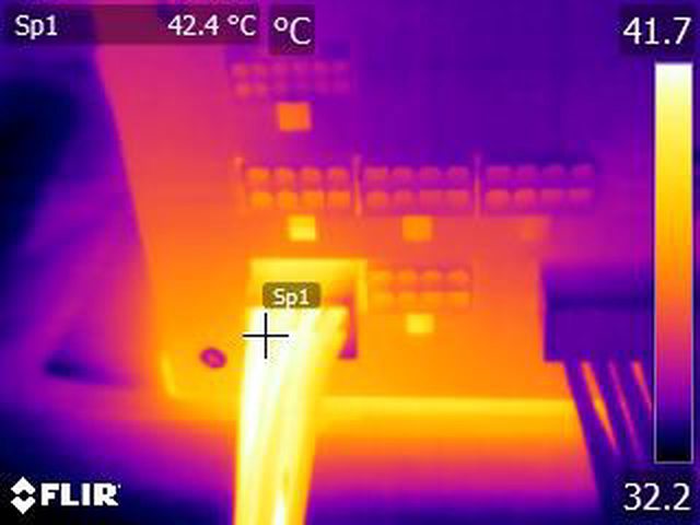 MOSFET/諧振電感(下圖)的紅外線熱影像圖(附註:安裝位置環境溫度會影響測試結果)
