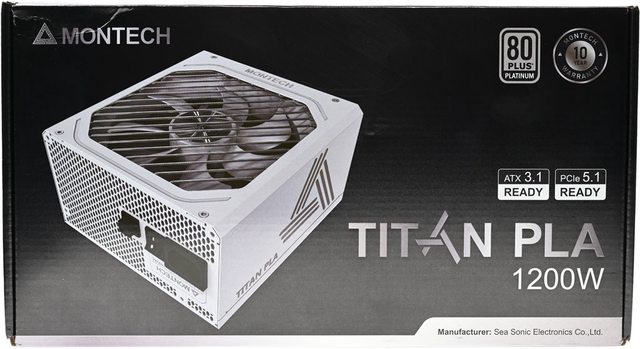 。外盒右側面有MONTECH商標、外觀圖、TITAN PLA名稱、輸出功率、ATX 3.1 / PCIe