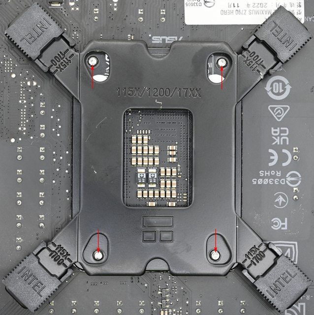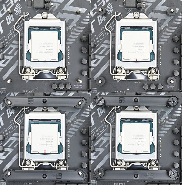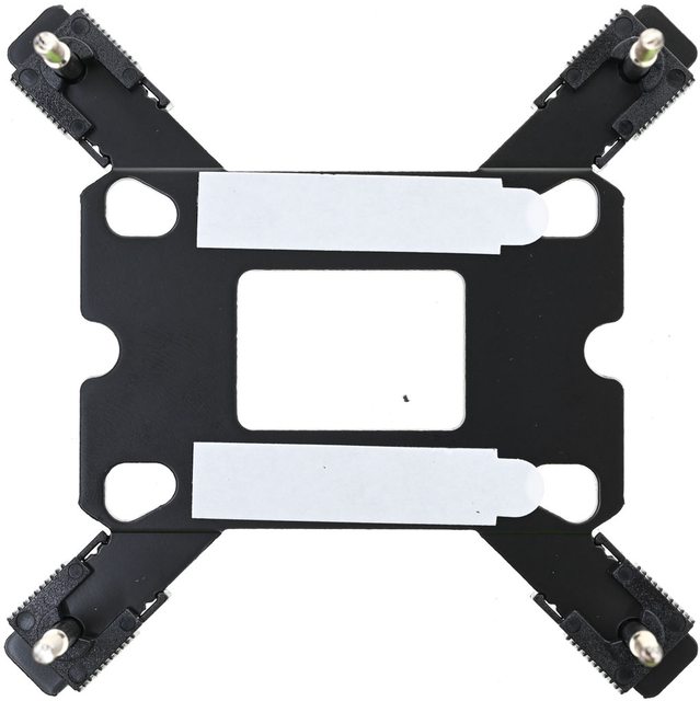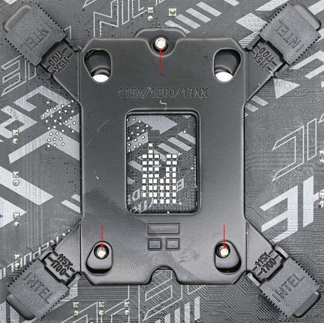 LGA1200/115x黑色套管套上固定螺柱(2),放上Intel托架(3),用4個Intel托架固定手轉