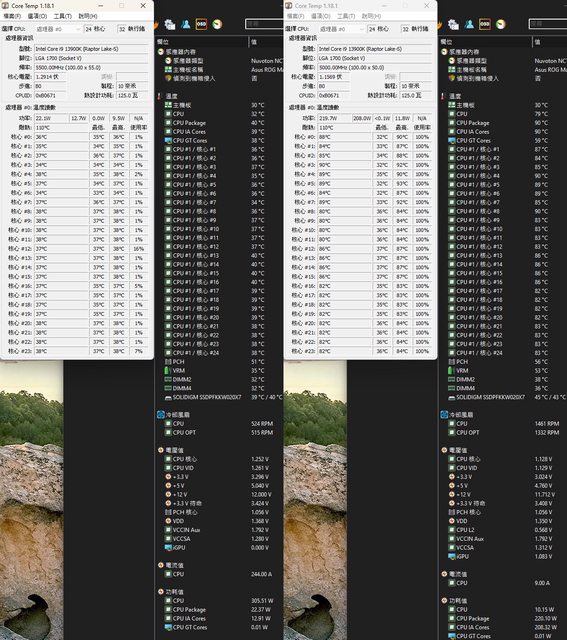 ▼功耗限制220W下待機(左)及高負載(右)的CORE TEMP及AIDA64感測器畫面