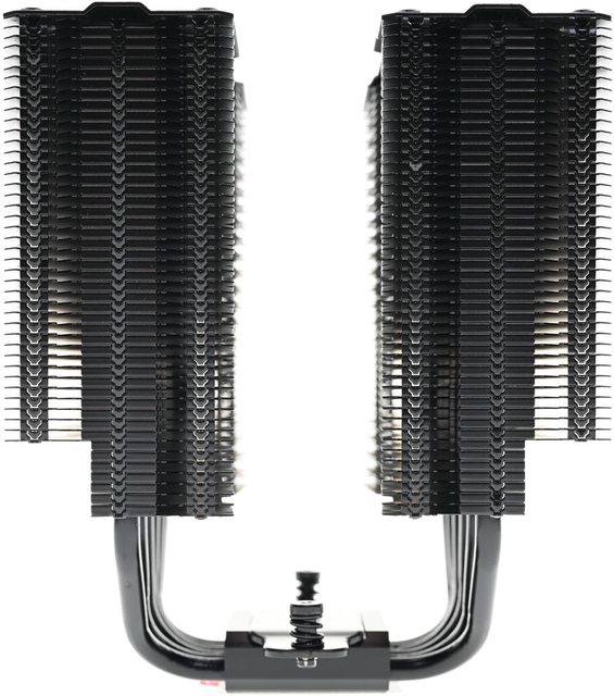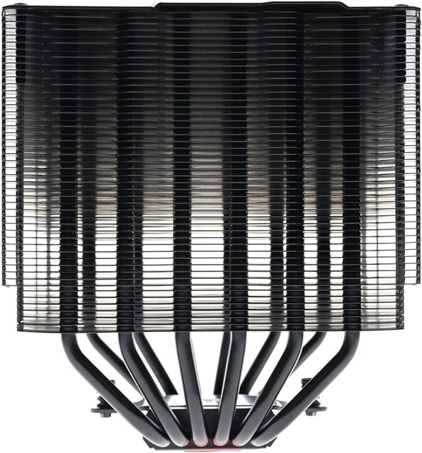 ●6支第五代無重力熱導管,搭配48層高密度鰭片,熱導管與鰭片均採黑化處理,頂部配