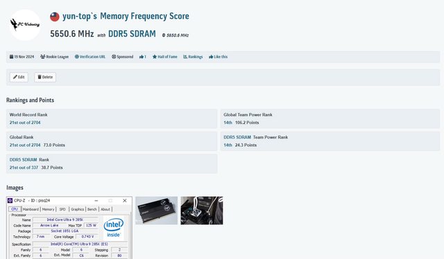MT/s,這次則是進一步再次於 Z890 OCF 上超頻至 DDR5-11036 MT/s (5518.3 MHz) ,確