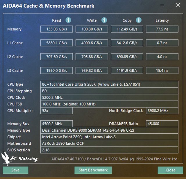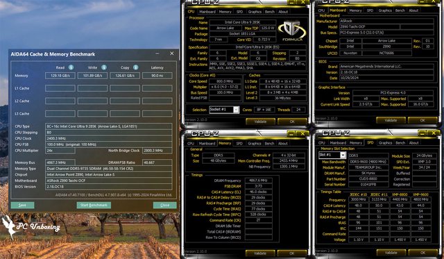 首先是以兩條手動超頻至 DDR5 9733 MT/s Gear4 並且進行了 AIDA64 記憶體與快取測試
