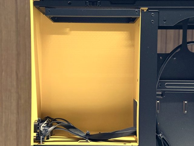 黃色跳色部分為電源艙,從右側上方延伸至前面板後做為IO位置,因此正面玻璃面板為了