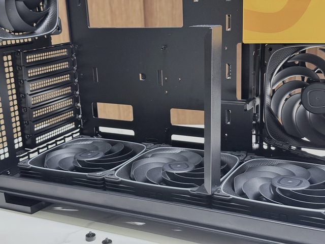 但這寬度要容納電源艙及420mm冷排,空間其實相當緊湊,也導致第一顆風扇需要轉方