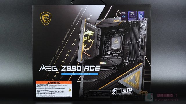 MEG Z890 ACE 外盒本體仍維持最能呈現尊貴質感的黑色背景,點綴的金色龍盾與 MEG 字樣