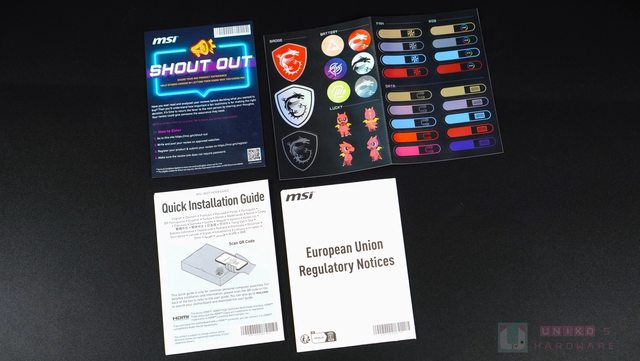 的 Steam 儲值金;第二份是快速安裝指南,第三份是歐盟規管通知,另一項則是微星信仰