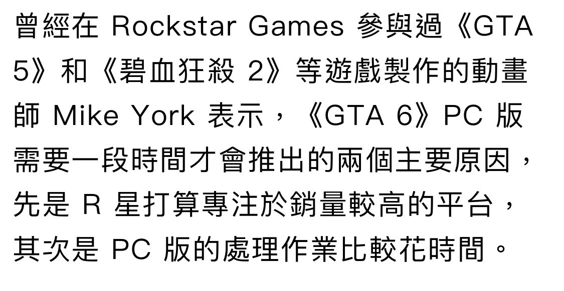 → ronga: GTA6首發目前跟GTA5一樣都是先家機平台 然後才移植到PC 12/20 08:46