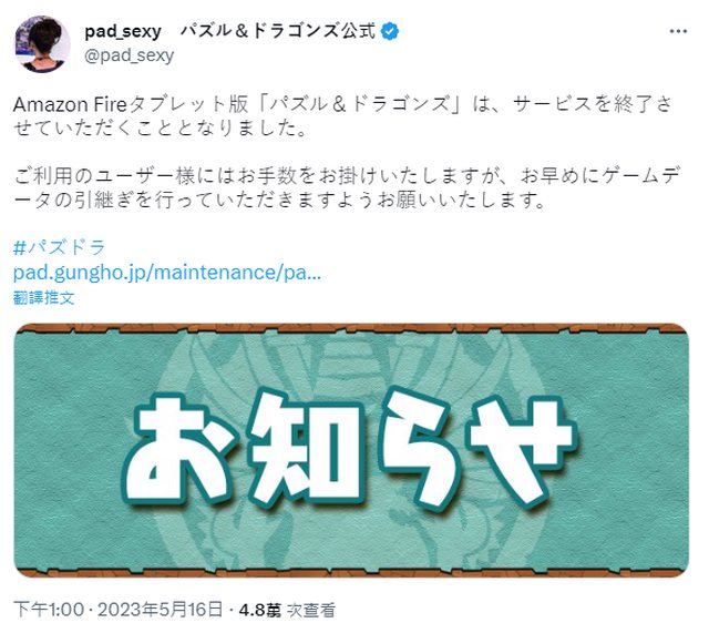 就是亞馬遜平板的版本要在8/14(月) 14:00(日本時間)後結束營運 使用此版本的玩家請轉移到 iOS、安卓 或 亞馬遜for安卓 版本 今年真的島了 - 另外安卓平台上的亞馬遜版本還有,所以這邊的課金管道應該是不受影響 -- ※ 發信站: 批踢踢實業坊(www.ptt-site.org.tw), 來自: 61.231.3.122 (臺灣) ※ 文章網址: https://www.ptt-site.org.tw/PuzzleDragon/M.1684214224.A.429