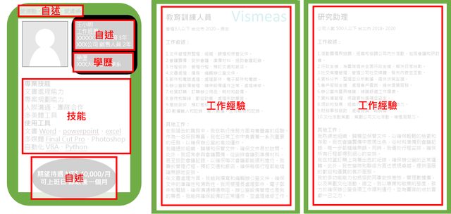 可以看到他履歷的第一頁的不同的 section (段落),並不是整齊劃一的