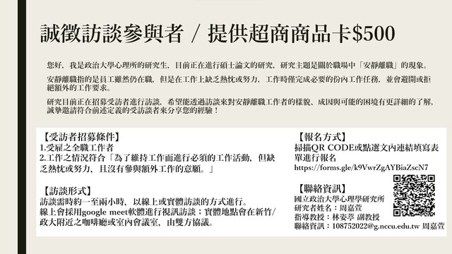 研究目前正在招募受訪者進行訪談,希望能透過訪談來對安靜離職工作者的樣貌、成因與