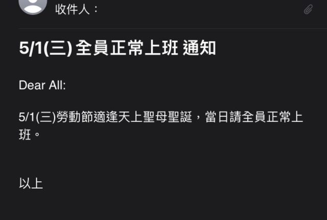 近期接近了農曆的媽祖誕辰,適逢勞工節國定假日,沒想到前公司會發出這樣的信件,要
