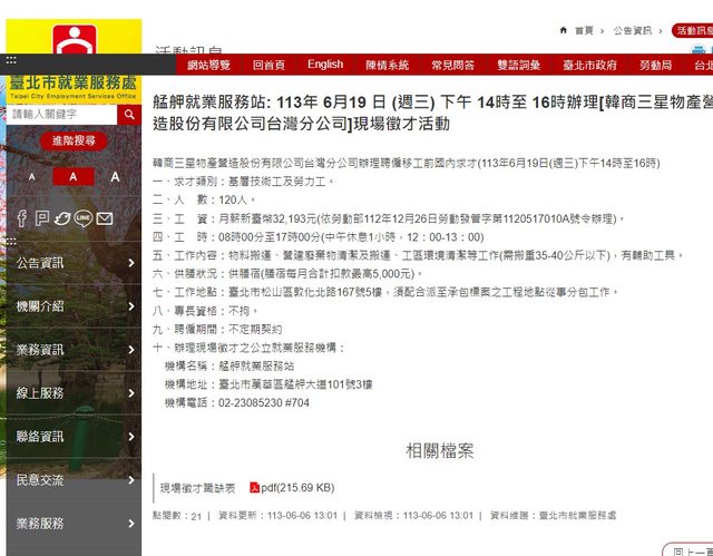 艋舺就業服務站: 113年 6月19 日 (週三) 下午 14時至 16時辦理[韓商三星物產營造股