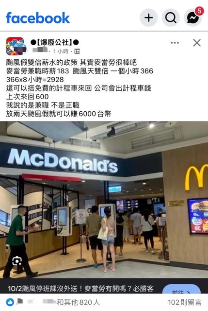 有網友在網路社群上分享:「颱風假雙倍薪水的政策,其實麥當勞很棒吧」,他透露:「