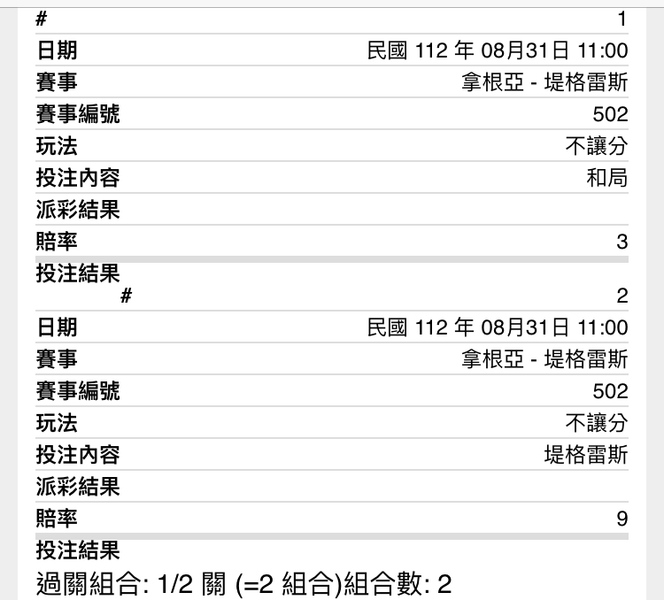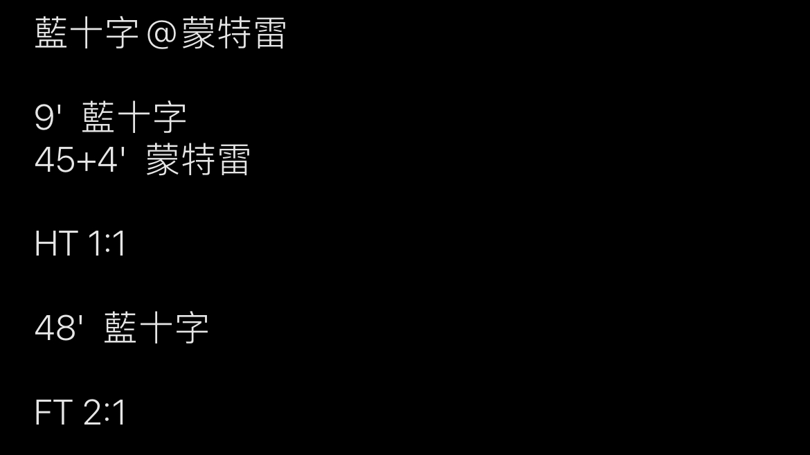 拿根亞 @ 堤格雷斯 11' 拿根亞 16' 提格雷斯 HT 1:1 46' 拿根亞 75' 提格雷斯 90' 提格雷斯 FT 2:3 -- ※ 發信站: 批踢踢實業坊(www.ptt-site.org.tw), 來自: 111.250.211.55 (臺灣) ※ 文章網址: https://www.ptt-site.org.tw/SportLottery/M.1693449088.A.784