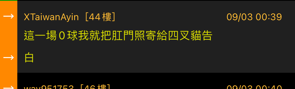 XTaiwanAyin: 這一場0球我就把肛門照寄給四叉貓告 101.3.146.61 09/03 00:39