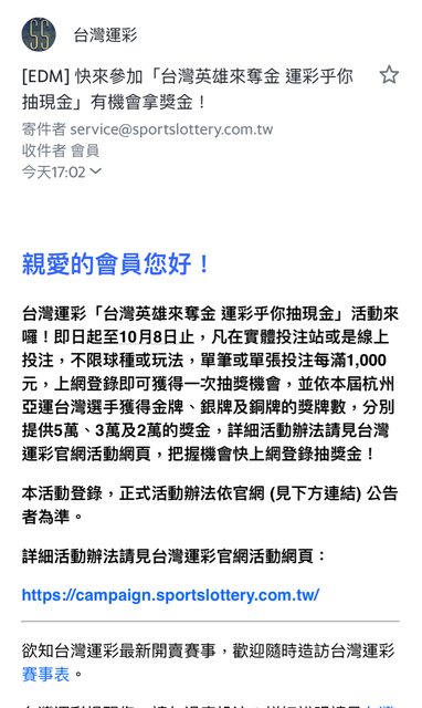 台灣運彩「台灣英雄來奪金 運彩乎你抽現金」活動來囉!即日起至10月8日止,凡在實體 投注站或是線上投注,不限球種或玩法,單筆或單張投注每滿1,000元,上網登錄即可獲 得一次抽獎機會 https://i.imgur.com/9LwGETk.jpg