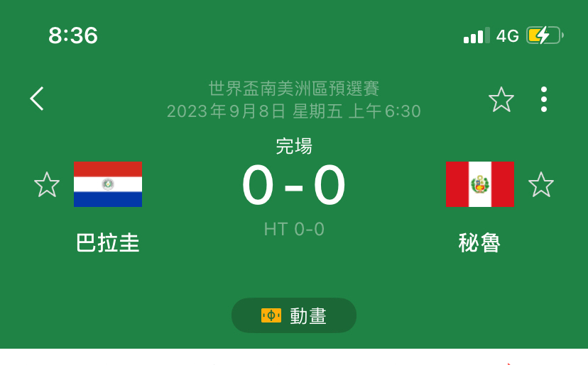 patron22: 請問剛剛踢完的秘魯巴拉圭有人知道比數 223.137.40.80 09/08 08:36
