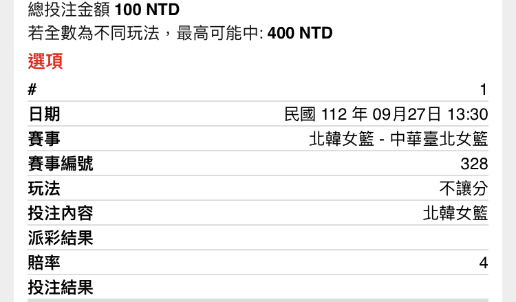 一 二 三 四 T 北韓 14 22 33 22 91 中華 17 16 25 19 77 -- ※ 發信站: 批踢踢實業坊(www.ptt-site.org.tw), 來自: 1.173.26.115 (臺灣) ※ 文章網址: https://www.ptt-site.org.tw/SportLottery/M.1695790803.A.8F9