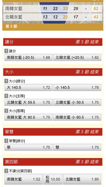 一 二 三 四 T 南韓 11 22 29 19 81 北韓 13 12 17 20 62 Q2開37.5->34 Q3開36.5->46 Q4 https://i.imgur.com/869i75D.jpg