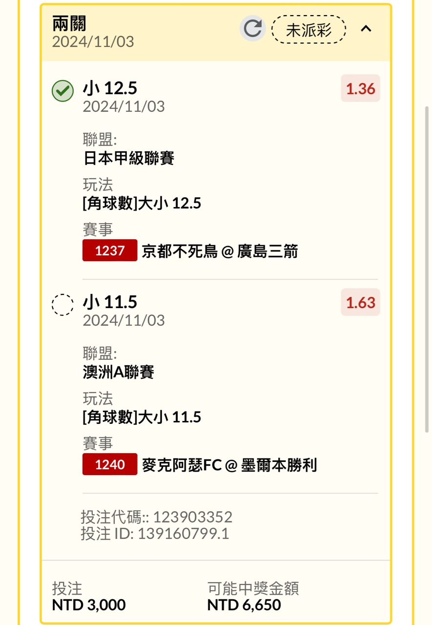 → twchih018: 爽 1.5大3k收 下一球串關也收 101.12.160.110 11/03 14:26