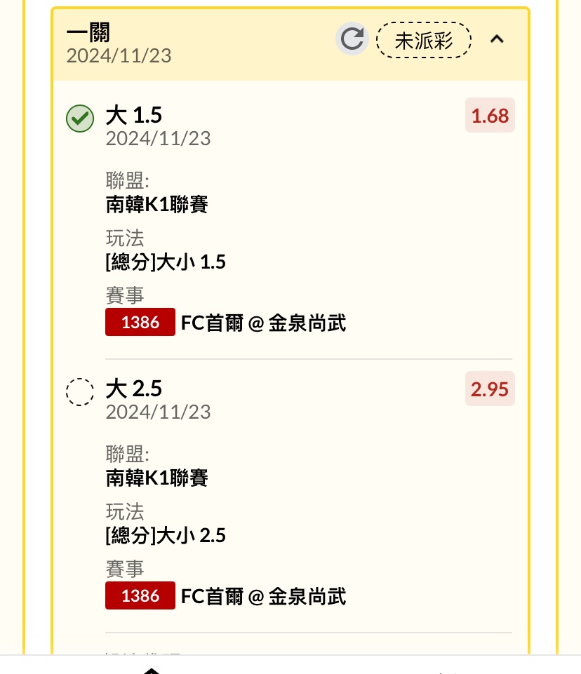 推 wang50005: 感謝bv大,全場1.5跟下半1.5都收 27.247.2.157 11/23 14:40