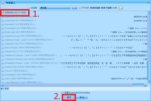勾選「所有字符」,點擊「確定」