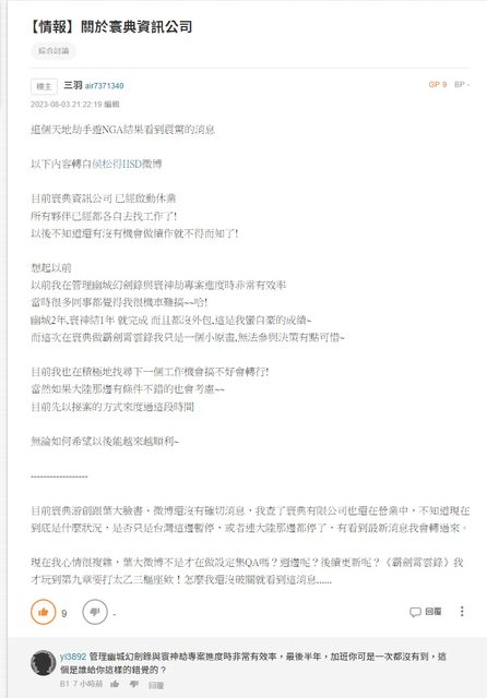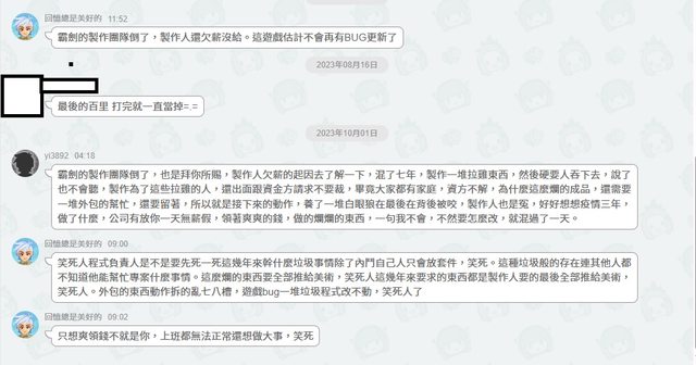 首先在巴哈有人轉過來的侯松得FB文章 這個叫yi3892的人直指侯松得最後半年不肯加班 侯松得是霸劍原畫陣之一,也是天地劫系列老班底 同一串下面這位yi繼續跟應該也是寰典相關人士的帳號吵起來 https://i.imgur.com/nBdZ8Nq.jpg