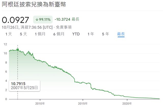 → RaiGend0519: 舉個例子,2020年初台幣兌阿根廷披索是1:2,到2022年 10/26 18:00