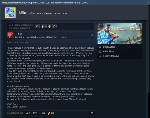 → Raquzza0526: 有時候你很難區分好/差評是針對遊戲本身還是其他技術 08/10 11:10