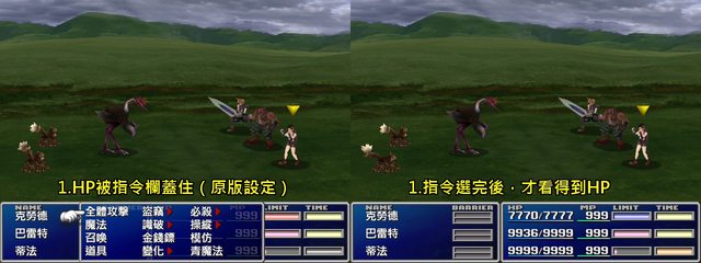 新增:可選擇戰鬥時的介面,讓HP不會被指令欄蓋住 戰鬥介面1.HP被指令欄蓋住(原版設定) https://i.imgur.com/pPlgtTM.jpg