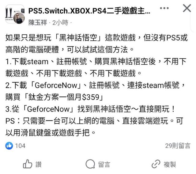 推 csp7382: 這波黑神話滿多人開始問GFN,不然就要花4w6買顯卡才能跑 09/08 11:08