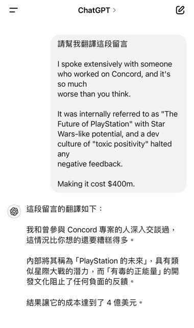 by ChatGPT: 我和曾參與 Concord 專案的人深入交談過,這情況比你想的還要糟糕得多。 內部將其稱為「PlayStation 的未來」,具有類似星際大戰的潛力,而「有毒的正能量」 的開發文化阻止了任何負面的反饋。 結果讓它的成本達到了 4 億美元。 不要再喂估狗了拜託== : == : 有猜過賠很多, : 但沒想有賠這麼多。 : 之前大部分人猜的價格有從5000萬到2億的。 : 這次數字直接跳到4億。 : 這已經是創下遊戲史上單一遊戲賠最多的歷史了。 : 敬請見證…… 依稀記得之前看過某片YT說過 若星鳴真的賠2.5億的話,不僅止於遊戲圈 可能會變成史上最賠錢的娛樂產品 https://i.imgur.com/vn0qWuP.jpeg