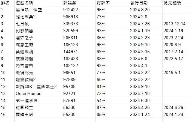 顯示在遊戲頁面上方的評論數是僅限在Steam平台購買的 如果是買顯示卡取得序號再評論 只會顯示在遊戲頁面下方的所有評論數中 本排名是按照所有評論數量統計 1 黑神話:悟空 912422 2 絕地戰兵2 906918 3 七日殺* 339373 4 幻獸帕魯 320599 5 陰森之子* 205811 6 滿意工廠* 185123 7 榮耀戰魂* 144971 8 夜族崛起* 102428 9 內容警告 102122 10 最後紀元* 98551 11 龍族教義2 97889 12 星際戰士2 95708 13 Once Human 92721 14 第一繼承者 87591 15 莊園領主 56330 16 霧鎖王國 55230 列到第16名 打*號為今年正式發行 但搶先體驗時間超過1年以上者 -- ※ 發信站: 批踢踢實業坊(www.ptt-site.org.tw), 來自: 36.224.219.123 (臺灣) ※ 文章網址: https://www.ptt-site.org.tw/Steam/M.1727857344.A.C7B