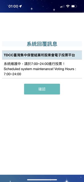 1. 找不到地方可以點回集保e手掌握的首頁, 只能關閉app再重開, 還是哪位大大能告訴我哪邊能返回? 2. 另外我一直認為線上化後, 除了短時間系統維護、特殊情形外, 應該是接近24小時的服務, 例如:網頁、email、app 沒想到,股東權益e服務(含eNotice),也是官方正在努力推廣的功能, 00:00~07:00有7個小時是不能用的 接近一天的三分之一了 https://i.imgur.com/Vh1AgL8.png
