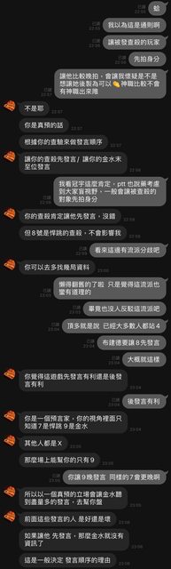 → eetug: 讓自己金水後講是可以多聽幾人發言,幫忙歸票,讓查殺先講 10/21 03:38