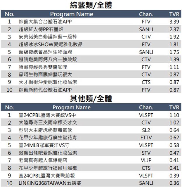 → lovelva00: 收視的只有綜藝節目和實境節目 10/25 11:46