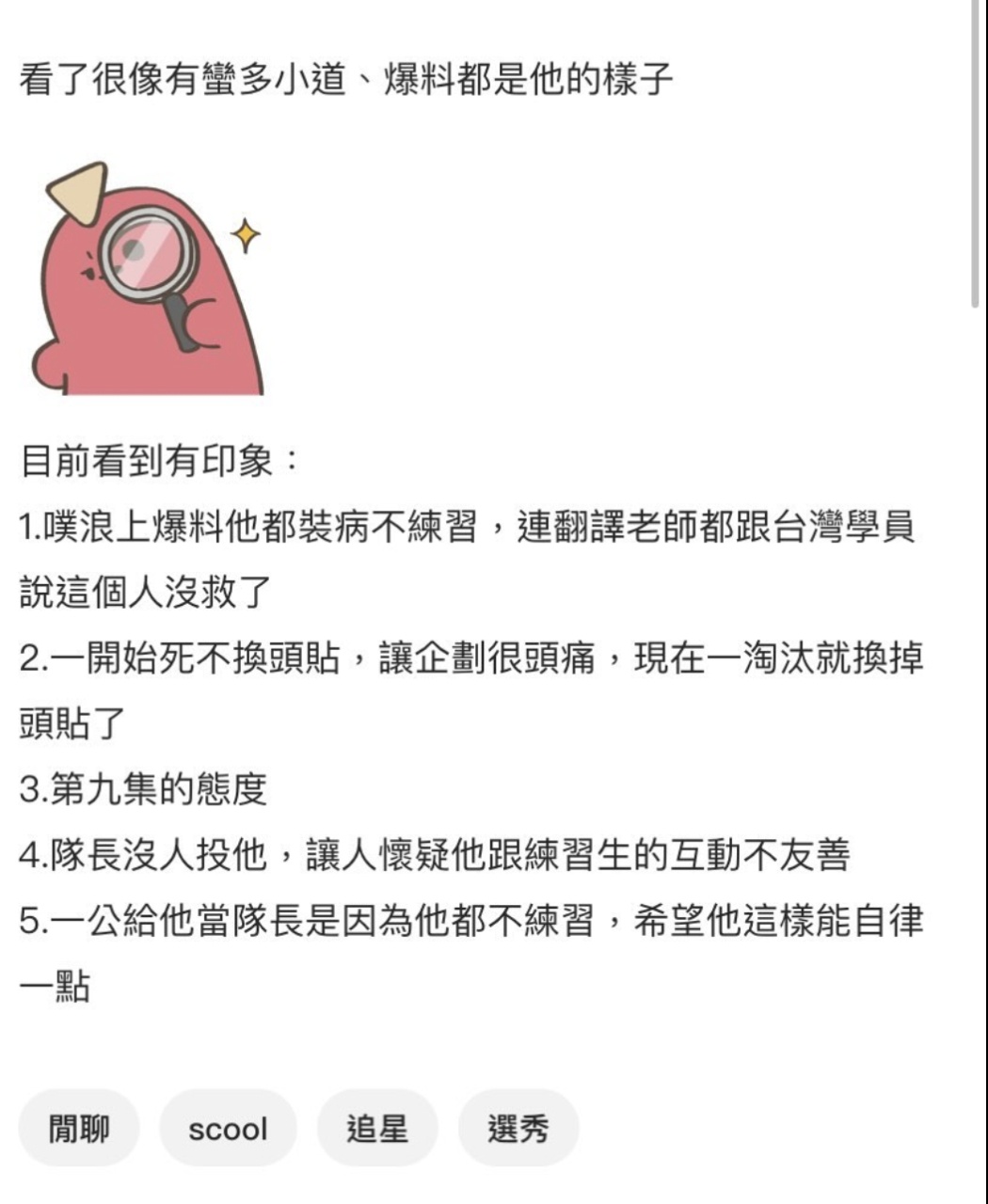 推 mtnattp: SCOOL五大類型代表:1麒文 2柏佑 3美祥 4學駿 5哲維 11/25 19:19