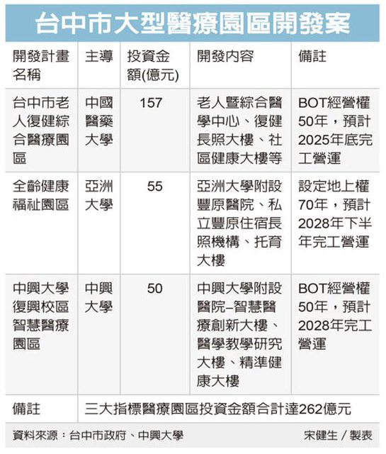 2023/07/12 00:51:28 經濟日報 記者宋健生/台中報導 台中地區將成為大型醫療園區重鎮,繼中國醫藥大學、亞洲大學投入大型醫療園區開發後 ,國立中興大學昨(11)日宣布,「中興大學復興校區智慧醫療園區BOT案」公告招商,1 0月4日截標,全案投資金額逾50億元,預計明年8月動工,2028年完工營運。 台中市政府統計,目前包括動工的中國醫藥大學「台中市老人復健綜合醫療園區」、剛定 案的亞洲大學「全齡健康福祉園區」,以及招商中的「中興大學智慧醫療園區」,總投資 金額合計達262億元,有助帶動相關產業與區域經濟發展。 https://i.imgur.com/U9Eqe1Z.jpg