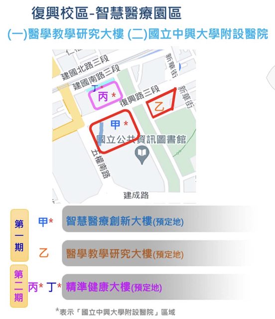 中興大學智慧醫療園區基地位於復興路三段、五權南路口的陸軍戰基處(戰車維修基地) 原址,緊鄰國立公共資訊圖書館,面積約2.48公頃,初步規劃分二期興建中興大學附設醫 院,包括智慧醫療創新大樓、醫學教學研究大樓及精準健康大樓。 中興大學去年8月成立醫學院,包括學士後醫學系與組織工程暨再生醫學博士學位學程, 是中部唯一的國立後醫系,同時與台中榮總、彰化基督教醫院、童綜合醫院及秀傳醫療體 系合作,提供實習場域。 台中市近幾年醫療體系建置日趨完善,其中以中國醫藥大學動作最積極,除在水湳經貿園 區打造新校區外,位於北屯區太原路三段、投資金額達157億元的「台中市老人復健綜合 醫療園區」也在去年10月動工。 這是台中市首間BOT經營的市立醫院,中國醫藥大學取得50年經營權,規劃1,262床、綜合 性以老人長照為主題的醫療園區,預計最快2025年底完工營運。 另外,豐原區中正路與豐原大道交叉口的「豐富專案」設定地上權開發案,今年6月初經 評定亞洲大學為第一優勝廠商。未來亞洲大學將在豐原打造提供急性醫療照護、運動醫學 、長期照護及產學合作的「全齡健康福祉園區」。 此案設定地上權70年,初步規劃興建亞洲大學附設豐原醫院、亞洲大學附設私立豐原住宿 長照機構及托育大樓,投資金額55億元,目標2028年下半年完工營運,初估可以創造2,00 0個就業機會,並吸引周邊產業進駐。 Ps, https://i.imgur.com/jfQjYzK.jpg